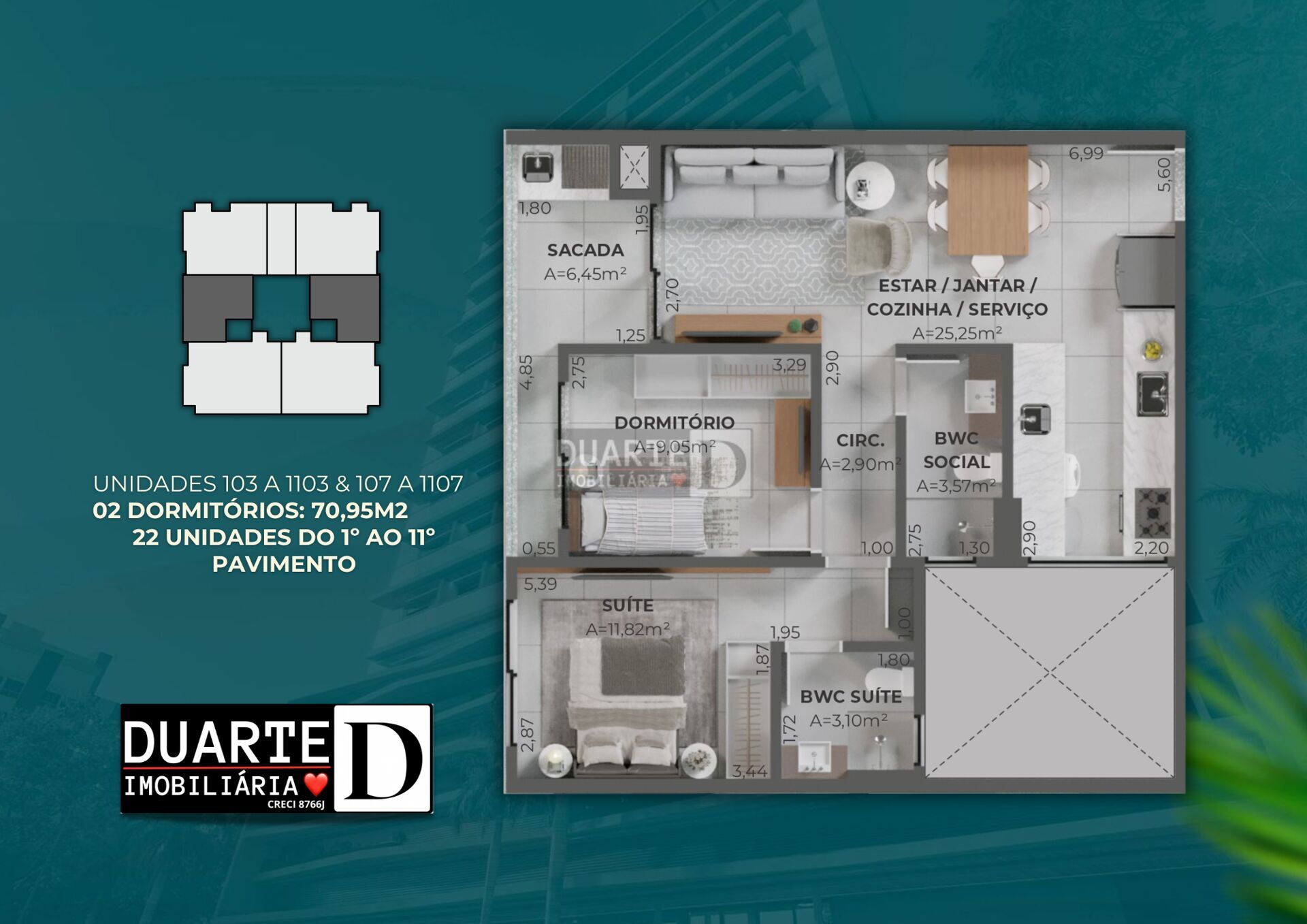 Descubra o equilíbrio entre conforto, praticidade e localização neste apartamento de 70,95 m², correspondente às plantas 3 e 7, localizadas entre o 1º e o 11º pavimento. Com 2 dormitórios, sendo 1 suíte, o imóvel oferece espaços bem distribuídos, ideais para quem busca morar com qualidade de vida em um dos bairros mais desejados de Palhoça.