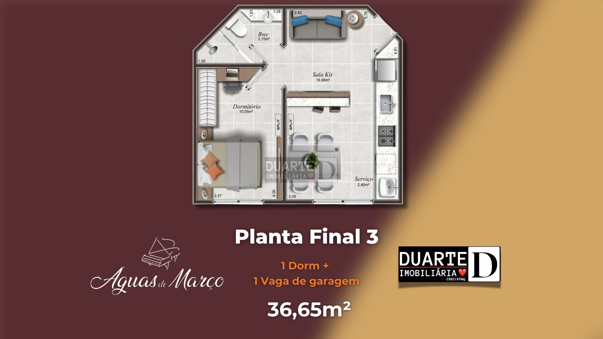 Com plantas inteligentes que variam de 36 m² a 61 m², o Águas de Março oferece unidades de 1 e 2 dormitórios, sempre com suíte, projetadas para aproveitar cada metro com funcionalidade e conforto. No sétimo andar, apenas duas unidades garantem exclusividade e ainda mais privacidade.